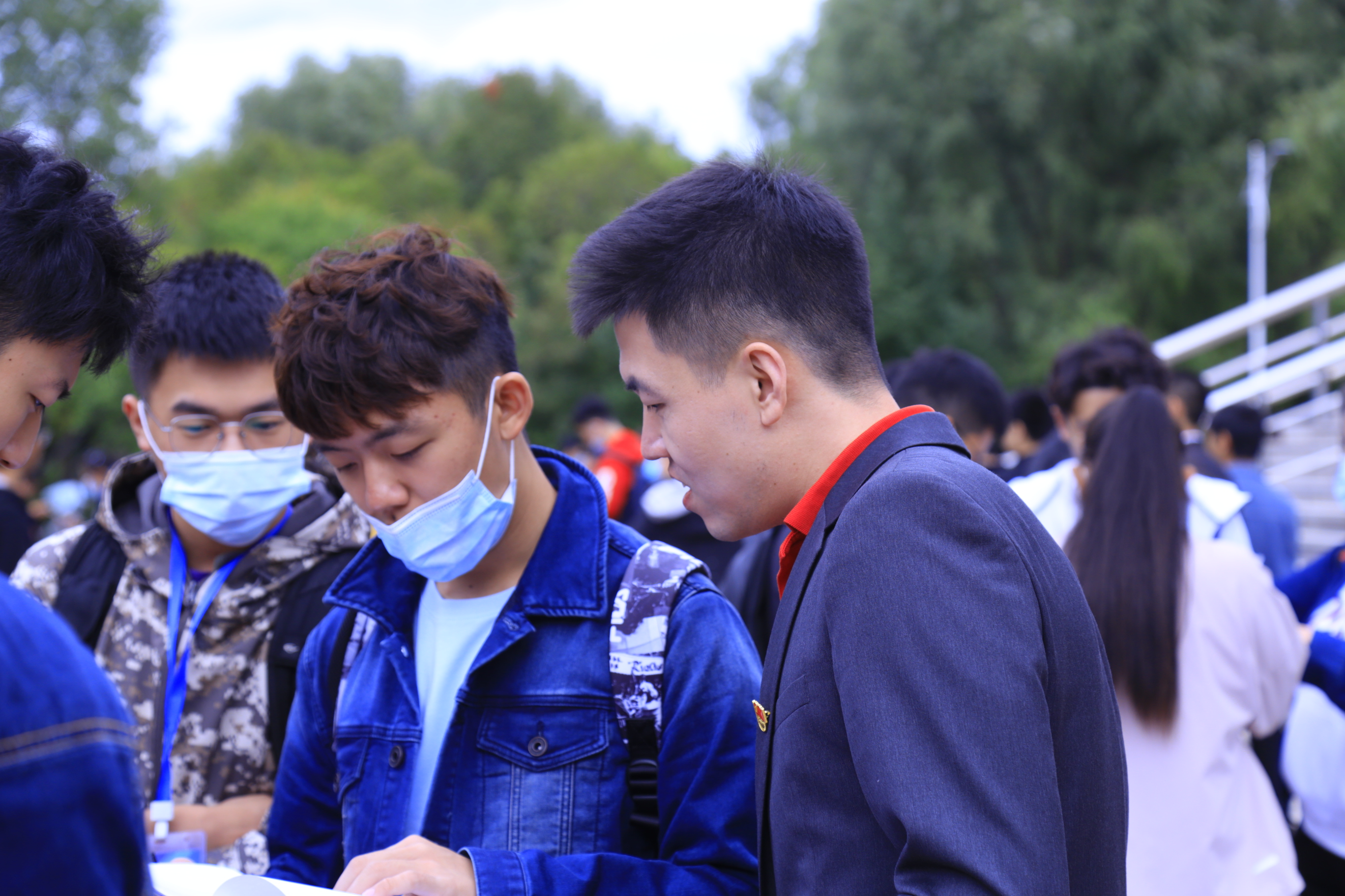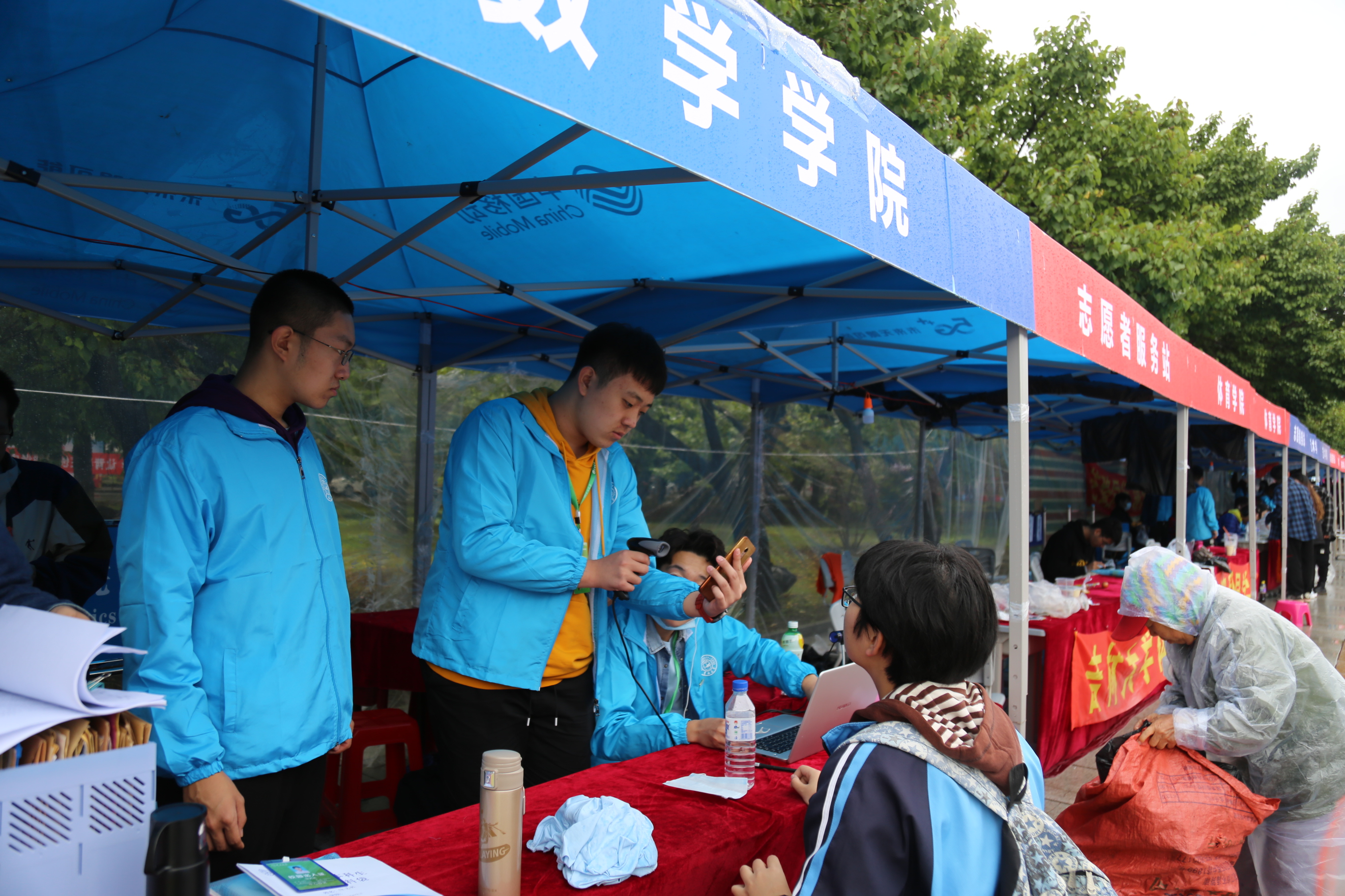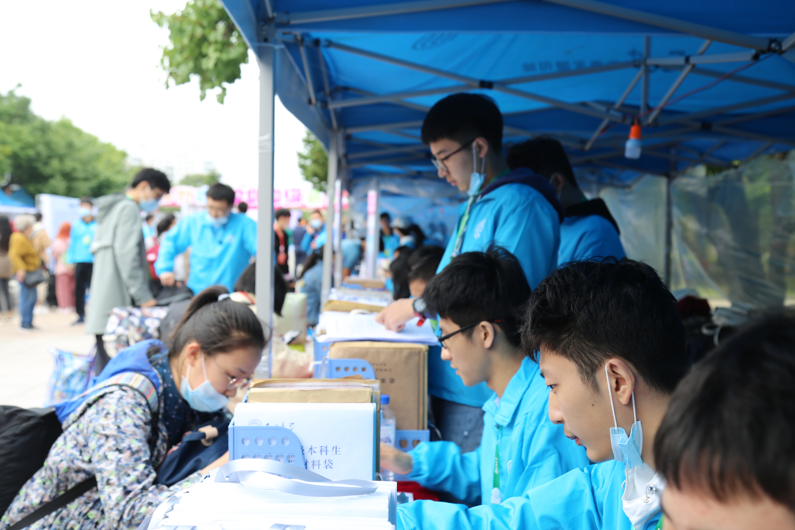 接新生工作正式开始。新生持录取通知书,从校门进入校园,在校门接待处需测温消毒、健康问询、核查“吉祥码”,随后通往五月花广场进行报道。我们拿着照相机在迎新现场,拍摄下新生们融入b站