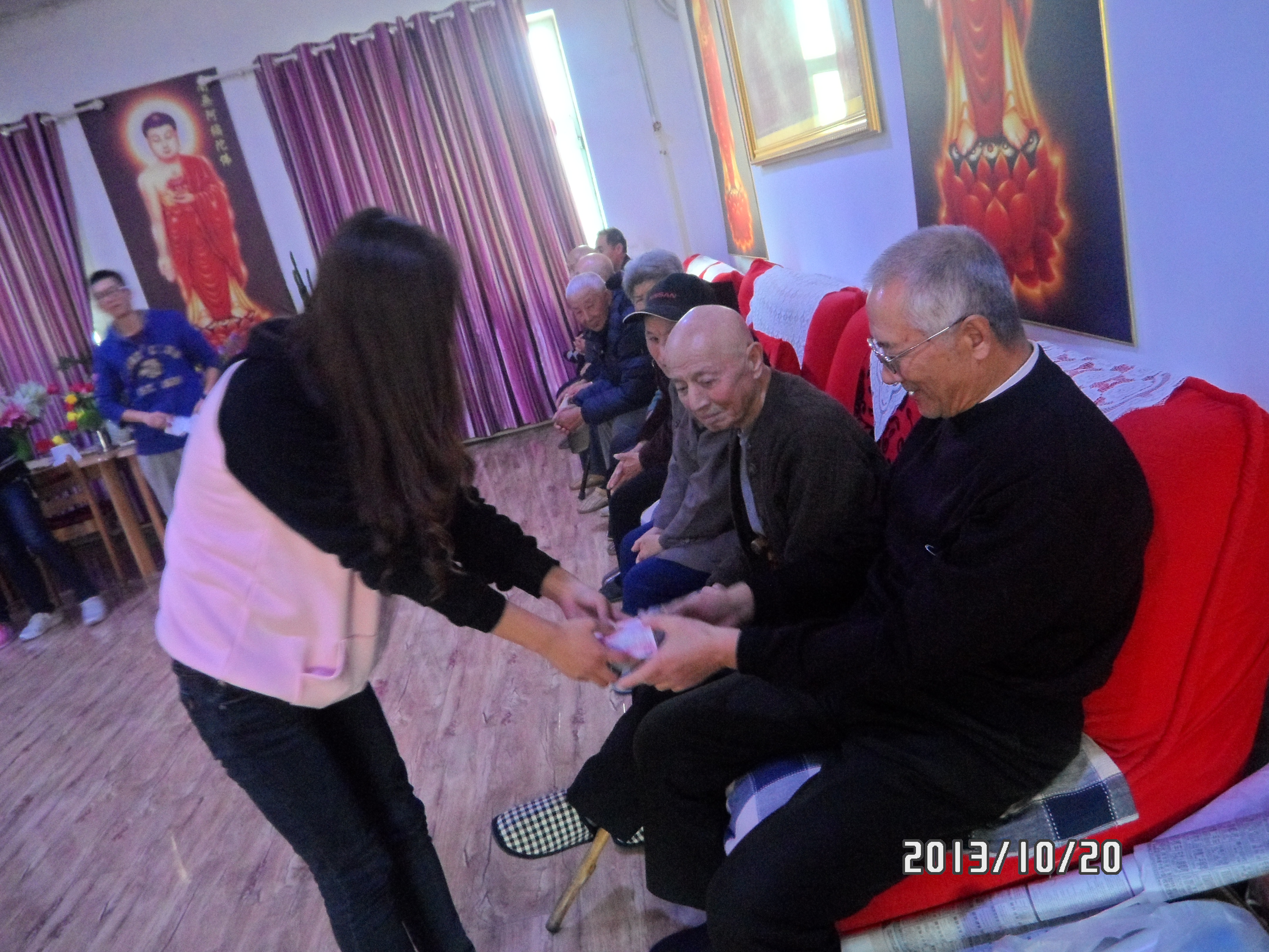 志愿者们来到老人的房间陪着老人聊天,聆听老人们讲述过去的故事,气氛十分融洽。老人们也都非常开心,不时发出爽朗的笑声,而他们的笑颜一并被志愿者们用相机记录下来。