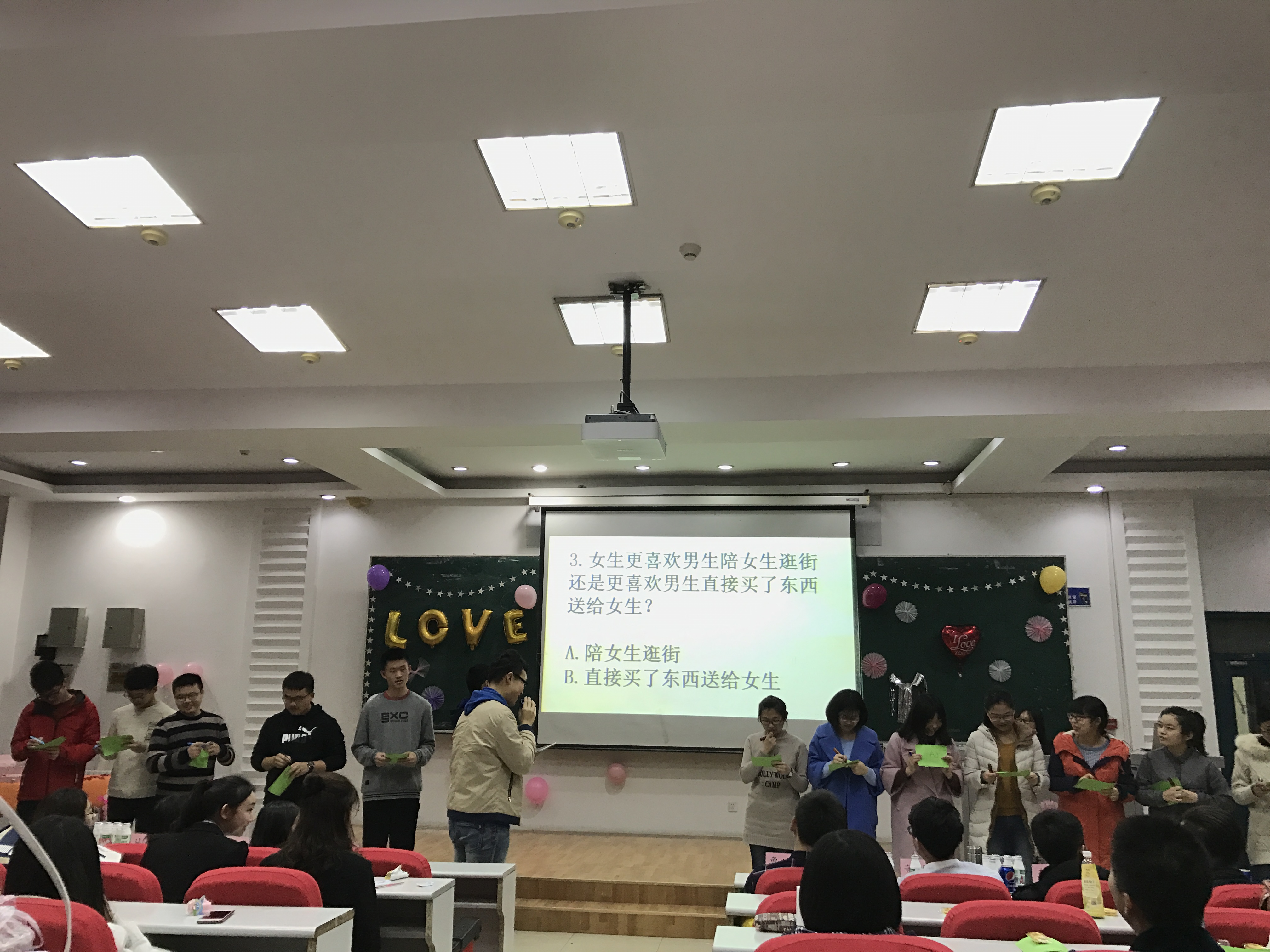 ,各班男生女生搭配后,携手参加各种妙趣横生的小游戏,最终,大一金数二班的代表队获得一等奖。过程中,女生享受着男生的关怀,与男生们愉快地互动,欢乐的气氛洋溢在整个活动现场。不仅如此,同学们也在活动期间通过各种线上活动发表心声,相互沟通、了解,其乐融融。
