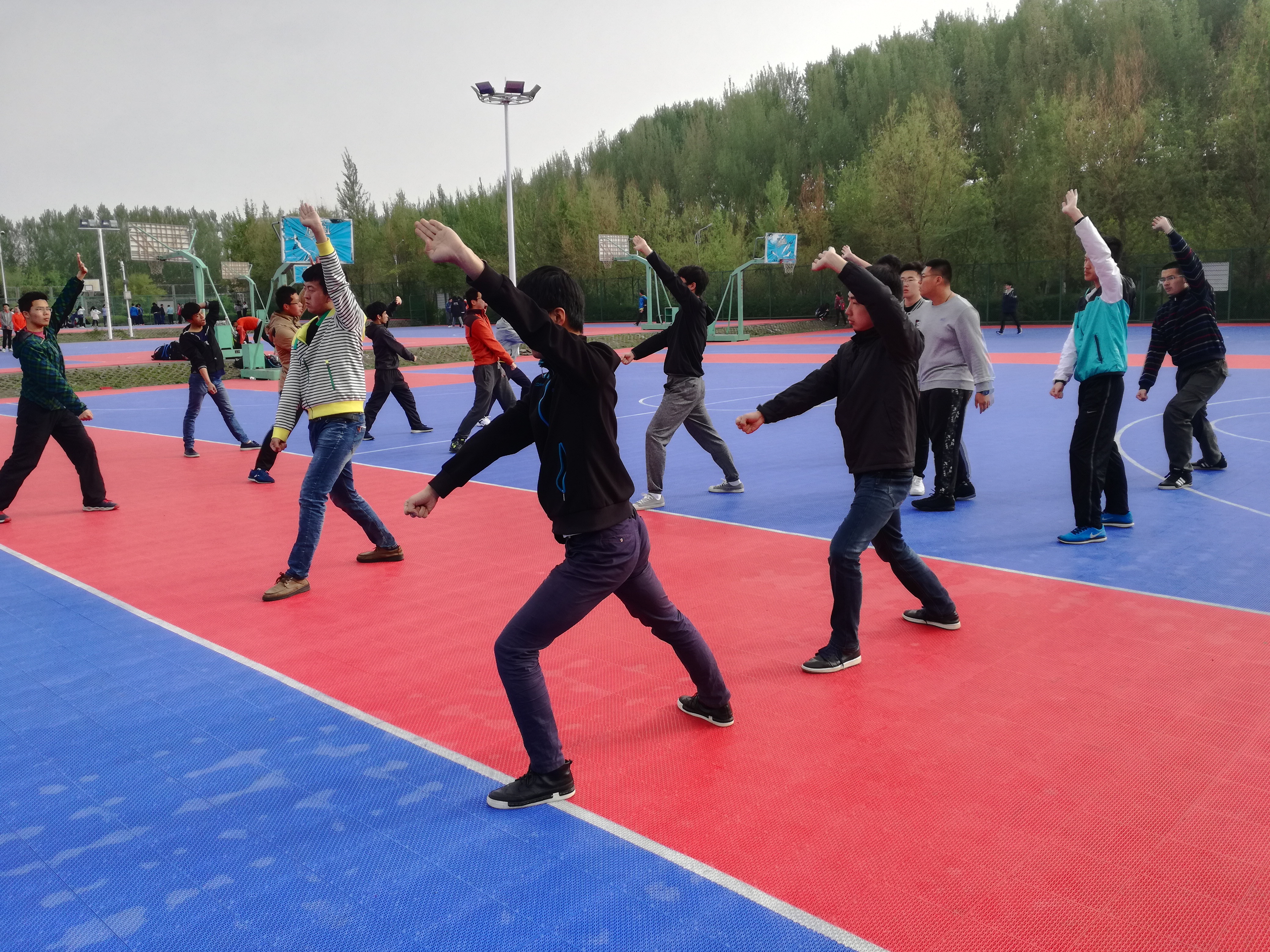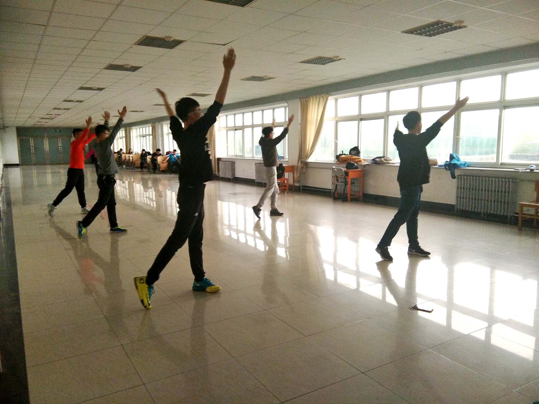 每早六点,参加太极拳和三路长拳训练的同学们准时到达训练场地。接着,在学生会女综部和生管会的带领下开始训练。一边是以柔著称的太极,一边是以刚著称的三路长拳。相比已经学了一学期的长拳,太极拳是大多数同学之前从未接触过的。但在“小老师们”的指导下,大家很快就能领悟到其精髓,打起拳来更是一招一式绝不含糊。大舞和广播体操一般在晚上排练。虽说初高中也学过类似的广播体操,但这一套广播体操更能凸显出大学生的朝气。大舞的排练现场,气氛更是十分活跃。律动的音乐加上同学们优美的舞姿,无一不展现出青春的活力。