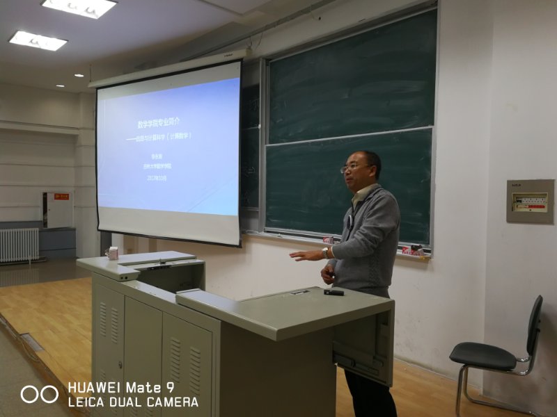 此次介绍大会由王德辉教授主持。首先,由计算数学系主任李永海教授介绍信息与计算科学专业,此专业最初为国家二级学科,两次被评为国家二级一流学科,随着大数学的发展,被评为国家一级学科。而今它的主干课程有数学分析、高等代数、空间解析几何、实变函数等,李永海教授也为我们介绍了相应学科的带头人,阵容十分强悍。随后,概率统计与数据科学系朱复康教授介绍了统计学相关知识,他称统计学不止是学科学,也学艺术。在定义之后,介绍了统计学门下的各个特色学科及其带头人,具体有应用概率论、大数据分析、数理统计、生物与医学统计等。最后还介绍了统计学与金融统计的内在联系。紧接着,应用数学系主任王春朋教授介绍的了数学与应用数学专业,此专业是b站