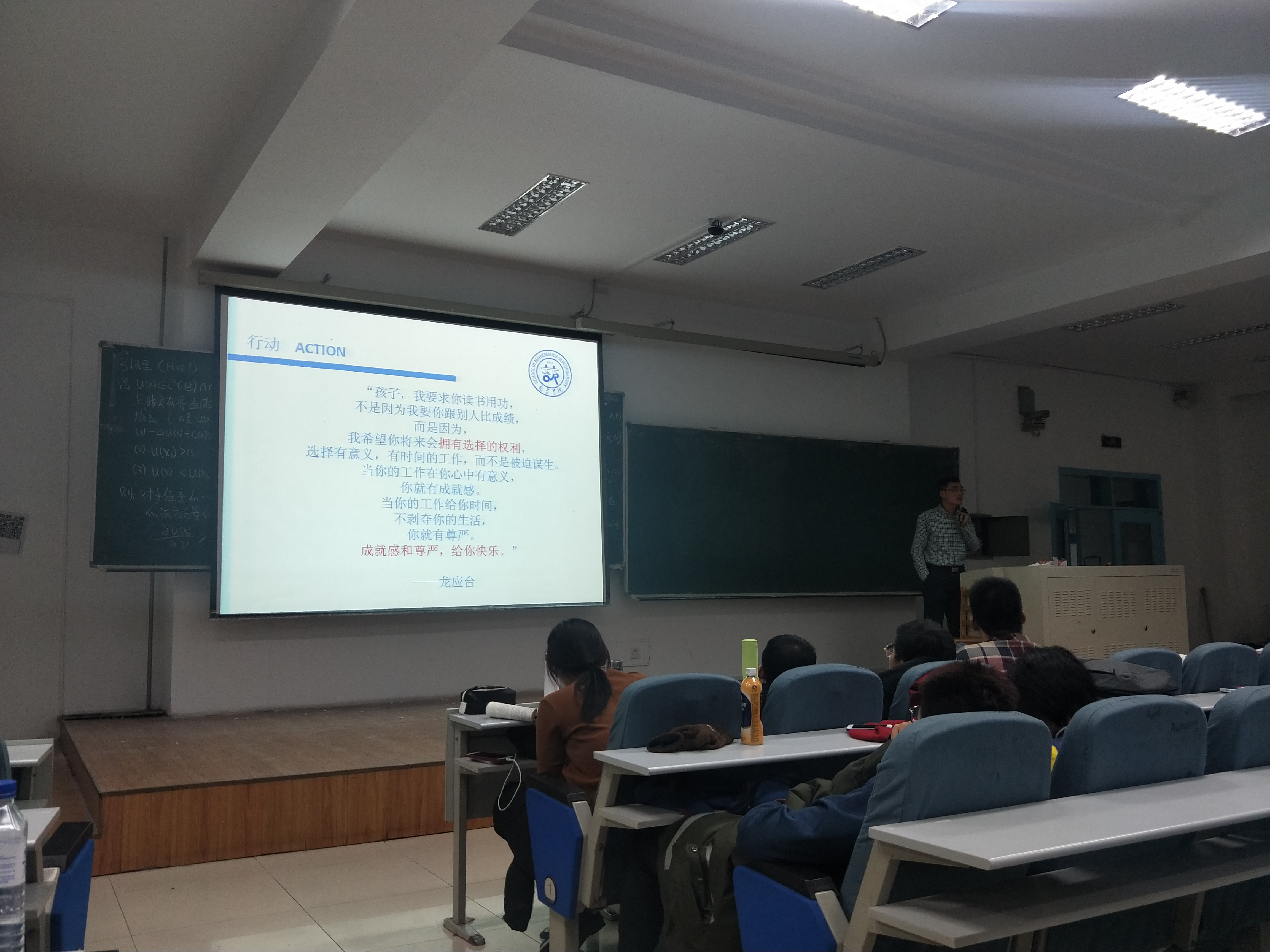 会上,崔帅老师首先向同学们讲解了本学期考试周、期末考试和放假时间安排,并要求大家从现在开始着手期末复习,充分利用好班级学习讨论小组,不断提高学习成绩;其次,简要介绍了数学专业的整体发展方向以及应该具备的相应条件;最后,要求同学们高度重视宿舍安全防火,并提醒同学们不要在清湖、宴湖冰面上行走。
