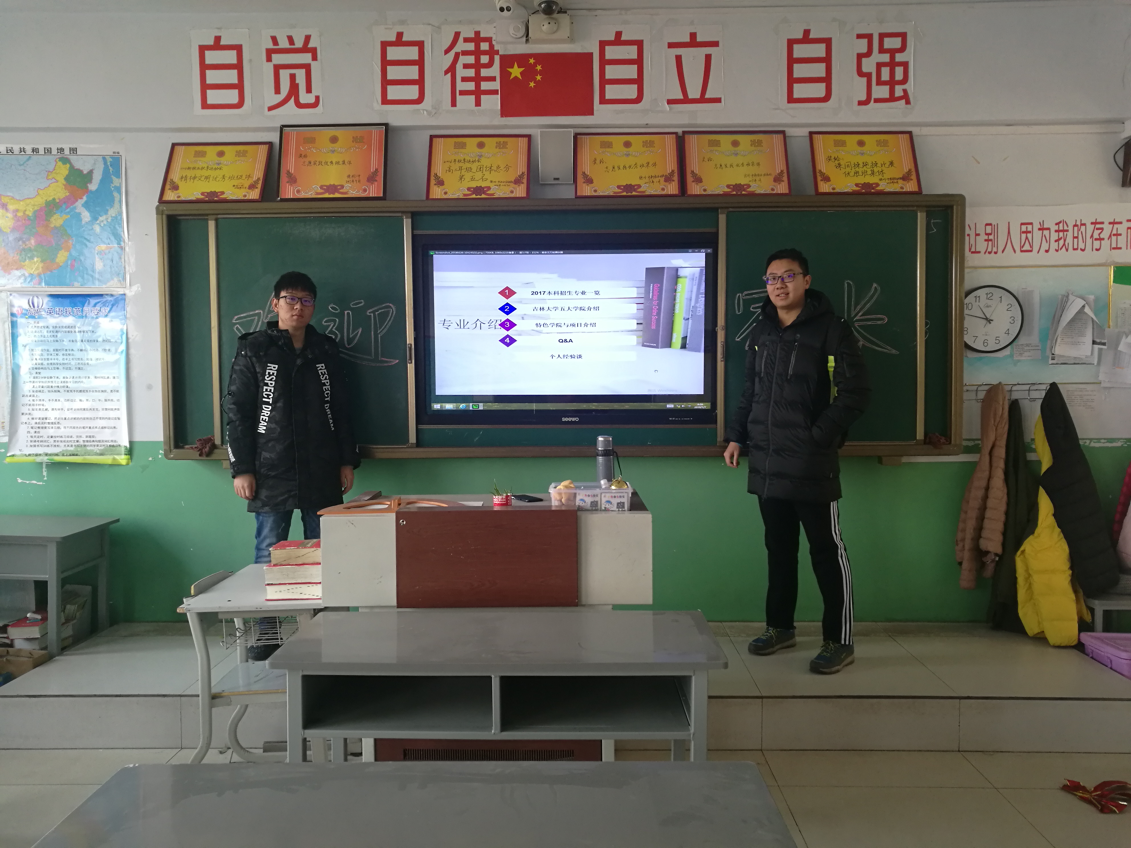 101612团支部在寒假期间分别派出三支宣讲队伍前往江苏省运河中学、山东省德州市第一中学、河北省保定市第一中学进行宣讲。宣讲队成员选择了形式丰富的宣讲形式。队员们首先通过发放宣传单、张贴海报等形式让同学们对我校有了一定了解并激发了同学们对我校的兴趣。在正式宣讲的过程中,队员们提前准备好了PPT、视频等资料,即使现场突发状况无法使用PPT,也利用投影仪将手机中的吉大美景放给大家看。队员们从b站