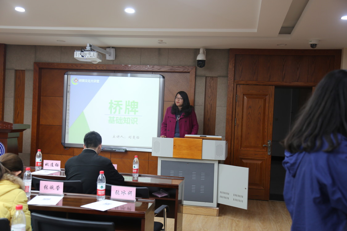 团委副书记兼社团联合会主席赵雯晗为吉林省桥牌协会颁发特殊贡献单位奖,学生会主席邱韵为长春市桥牌协会颁发特殊贡献单位奖,由团委副书记李潇琦为刘曼怡颁发特殊贡献个人奖。再接着,资深桥牌达人刘曼怡为我们讲解了基础桥牌知识,桥牌到底该怎么玩。刘曼怡为我们到场的每个人都布置了在线桥牌练习,大家也都纷纷拿起手机下载app,然后开始试玩。刘曼怡带着台下的同学们分析每个练习的出牌策略,让我们从对桥牌的一无所知到成为入门新手。