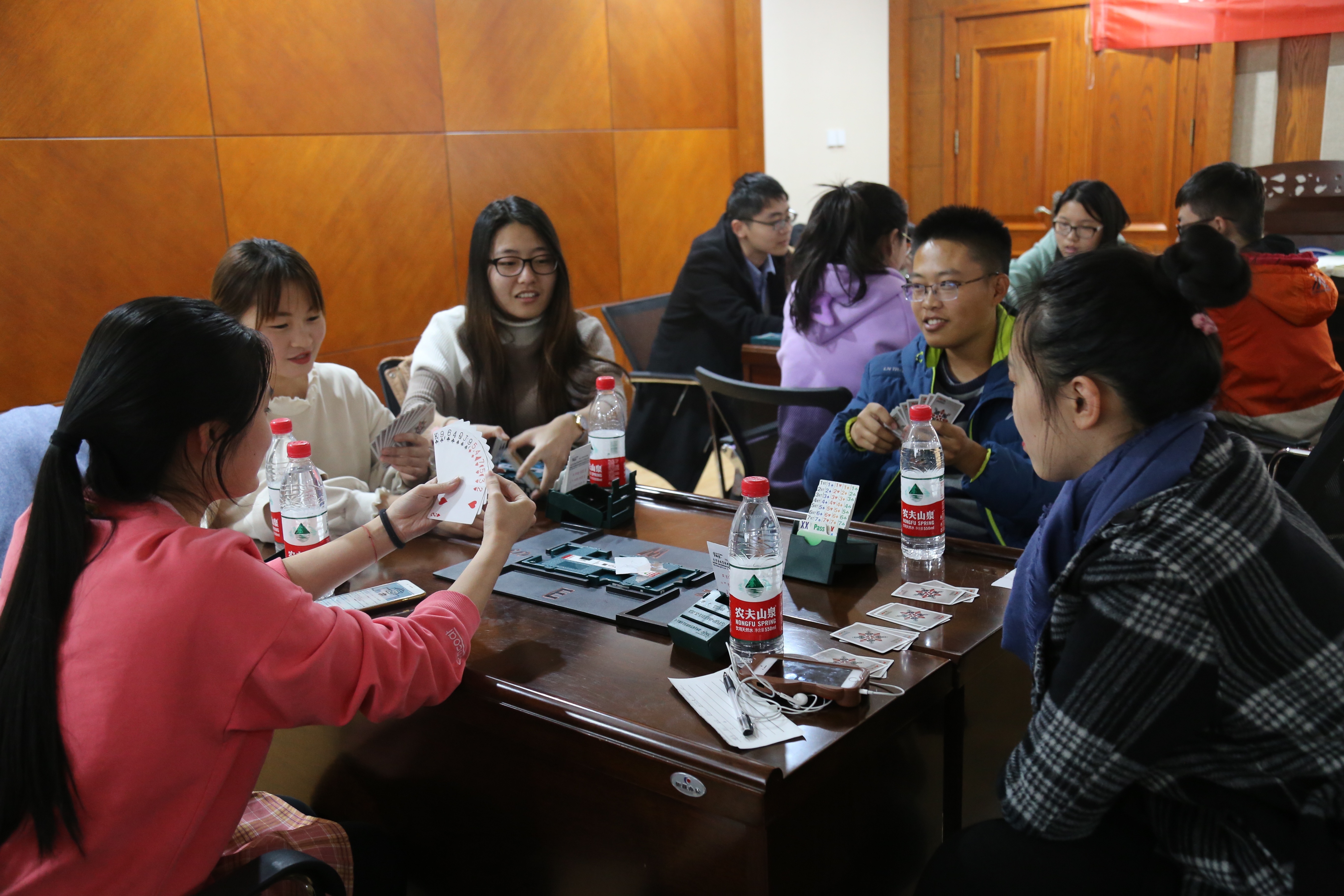 比赛中途穿插了3-4次休息环节以及提问桥牌知识讲座所介绍的桥牌知识,以增强大家对桥牌知识的了解。同学们积极抢答,大展风采,同时丰富了自己对桥牌的知识了解。