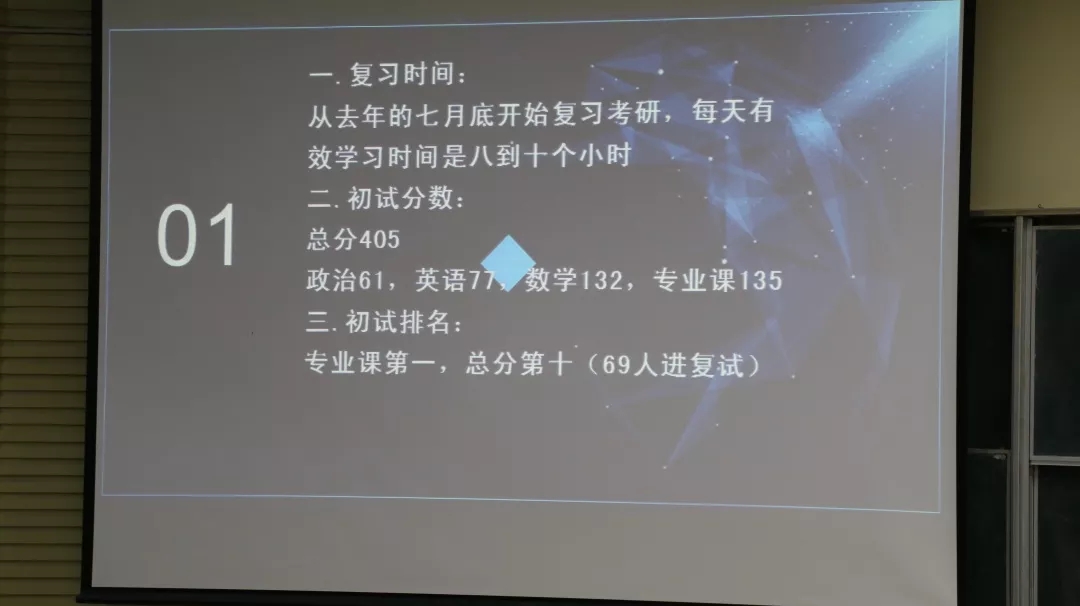 辛悦学姐向我们简述了考研考试的流程时间表、注意事项等,给我们传授了关于考研方法的经验,推荐了适合不同阶段高质量的参考书。单瑞彤学长分享了他考研的参考书目以及他对考研的看法,要尽早明白为什么去考研,考研的目标是什么。要调整好心态,懂得坚持会让你走得更快。考入中国科学技术大学的李鹏飞学长针对报考择校给我们详细地分享了他的经验。刘博学长则是从他考研的自身经历出发,提醒同学们英语的重要性,以及要多了解报考学校的相关资讯。考入中央财经大学的厍馨予、董倩学姐则向我们讲解了一些相近的概念,比如专硕和学硕,全日制与非全日制,定向与非定向。考入中国人民大学的隋尚廷和闵鹏瑾学长也提出了自己的学习方法用以参考。考入北京师范大学的庄珊珊和王晗学姐提醒了我们在考研初试复试上事先掌握好时间、考点,是否需要住宿等一些注意事项。考入其他名校的学长学姐也关于个人经历、考研准备、择校报考及注意事项等方面,全方位、多层次地进行了讲解。