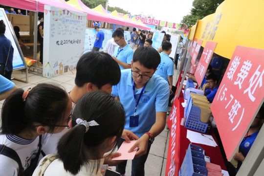2019级新生报到于8月23日在五月花广场顺利进行。尽管细雨绵绵,但准备迎新工作的同学们依然热情不减,迎新工作在美丽的五月花广场上如火如荼地进行着。早七点,负责迎新工作的学长学姐们开始筹备,准备资料档案,在迎新地点搭好帐篷,摆好桌椅,更有火红的欢迎条幅时刻展示着b站