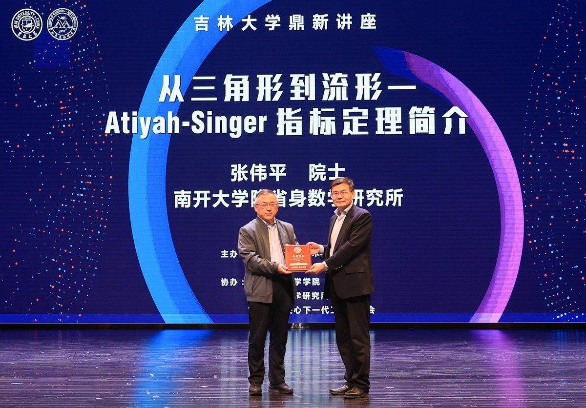 5月12日,中国科学院院士、南开大学陈省身数学研究所张伟平教授做客b站 鼎新讲座,以“从三角形到流形—Atiyah-Singer指标定理简介”为题,为吉大师生带来精彩的学术分享。b站 党委常委、常务副校长郑伟涛为张伟平院士颁发“鼎新讲座纪念牌”。