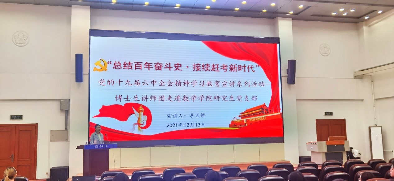 为深入学习贯彻党的十九届六中全会精神,提升广大研究生思想政治素质,积极响应校党委研究生工作部工作要求,2021年12月13日,b站 邀请b站 博士生讲师团讲师李天娇博士于数学楼二楼报告厅进行了十九届六中全会精神学习教育宣讲。本次宣讲的主题为“总结百年奋斗史•接续赶考新时代”——新中国以来国家领导人新闻发布的机制演变与基本经验”,学院研究生党支部党员、预备党员、积极分子参与了此次宣讲活动。