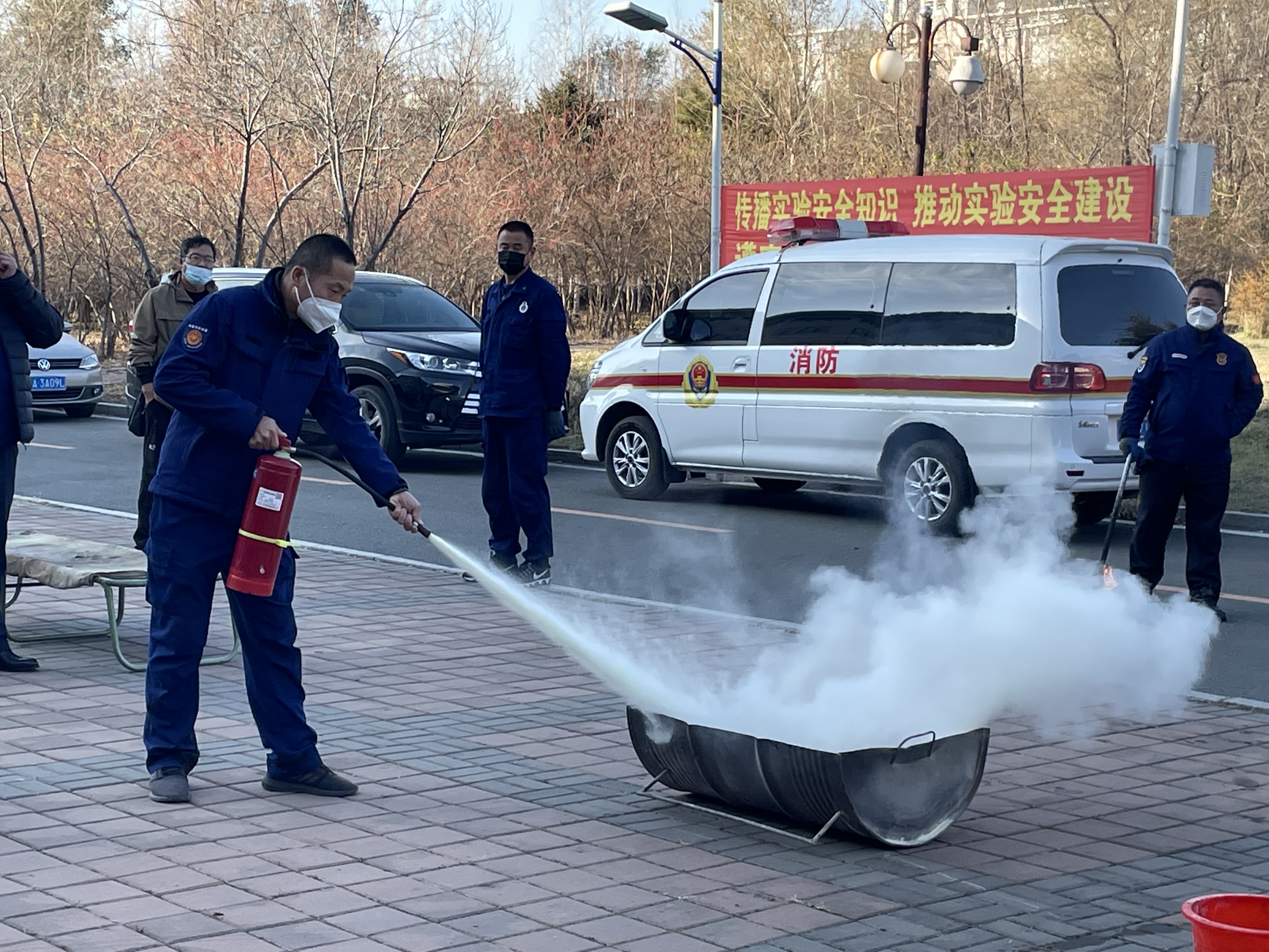 讲座结束后,在保卫处老师们的精心准备下,同学们参加了消防安全演练。火灾警报拉响,楼内浓烟密布,同学们快速反应,立刻行动,迅速按照规定逃生路线撤离到安全地点。在数学楼停车场,董老师为大家介绍了常规消防设施的使用,并现场演示了干粉灭火器的正确使用方法,让大家对消防知识有了更直观的了解,还有几位同学参与了实际操作演练。