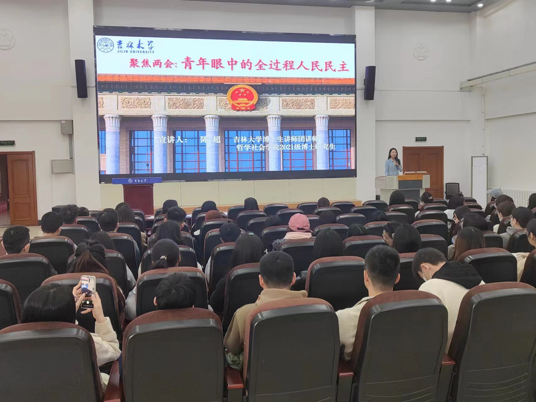 在本次宣讲中,陈超首先带领大家学习了习近平总书记在全国两会上的重要讲话精神和全国两会精神,以两会制度作为中国式民主的生动窗口为切入点,讲述了我国两会制度的由来与发展,并从政治、理论与实践层面,对中国式民主道路的核心特征——全过程人民民主进行了详细讲解。其次,陈超结合自己参与中国共产党b站