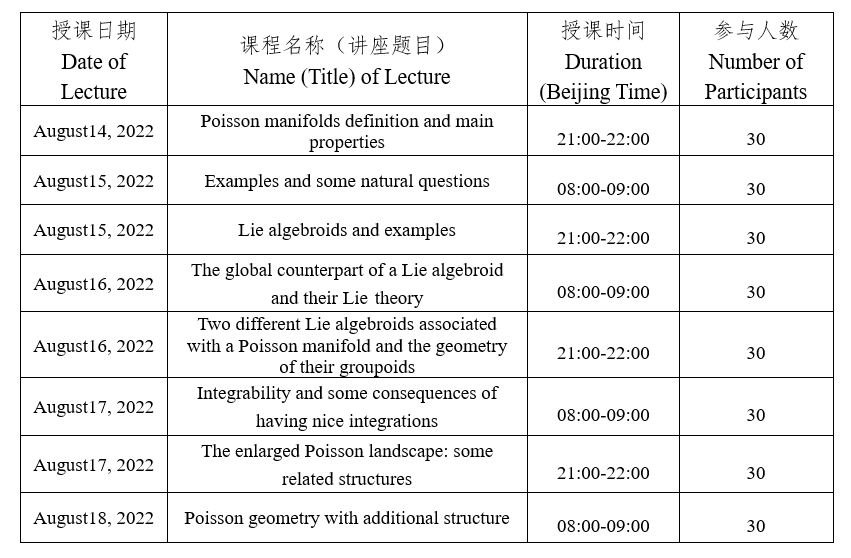 课程介绍:Poisson geometry is a lively area of research that lies at the crossroads of several fields in mathematics. On the one hand, it lies at the intersection of symplectic geometry, Lie theory, and foliation theory; and on the other, it serves as the background for several theories in mathematical physics. Though Poisson brackets can be traced back to the XIXth century, its current incarnation started in the late 1970s with the work of Lichnerowicz and rapidly developed as a field in its own right as well as through connections with other areas of mathematics. In this mini-course, we aim at introducing Poisson manifolds and offer a panoramic view of some classical and modern developments of the theory. We will start with basic definitions and properties of Poisson manifolds, some foundational results, and a wealth of examples. We will then discuss the connection to Lie theory exploring the larger world of Lie algebroids and Lie groupoids and their geometry. We will recognize that the algebroids naturally associated with Poisson manifolds come with additional geometric structures and discuss when these can be integrated to multiplicative structures on their Lie groupoids. Lastly, we will gloss over a collection of related structures and close with a particular class of examples: Poisson-Lie groups.