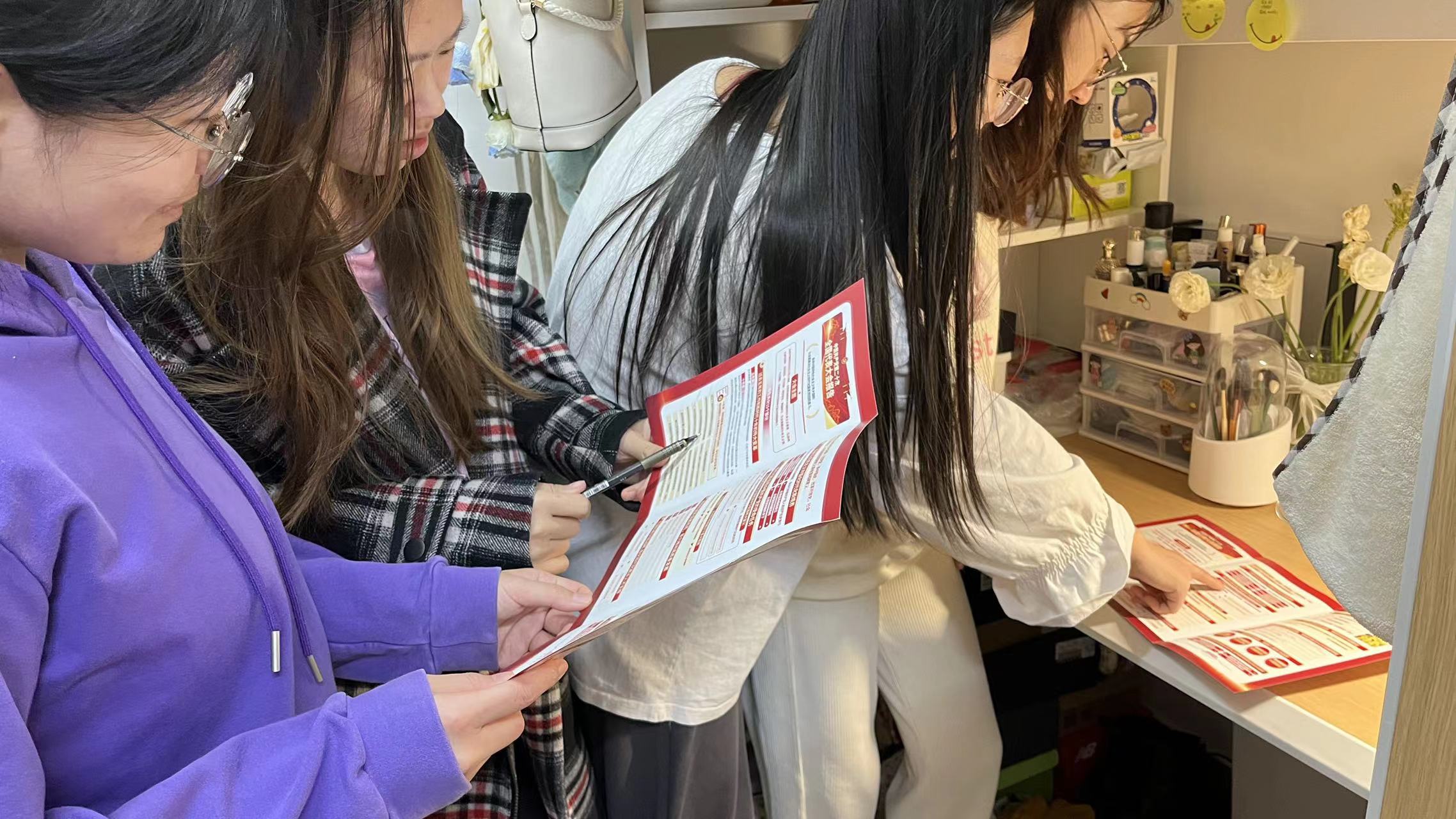 学院研究生会宣传部的同学联合支部党员收集、学习二十大会议中出现的新词、热词、焦点词以及会议精神,将会议的主要内容制作成二十大学习折页与海报,分别发放到各个寝室,带领大家一起学习。同学们都表现出洋溢的热情,将自己的所思所想一起分享,并认真翻阅学习折页,主动将海报张贴在寝室门外面,寝室楼内学习氛围浓烈。经过大家的相互交流学习,同学们对于二十大报告有了更深入的了解。