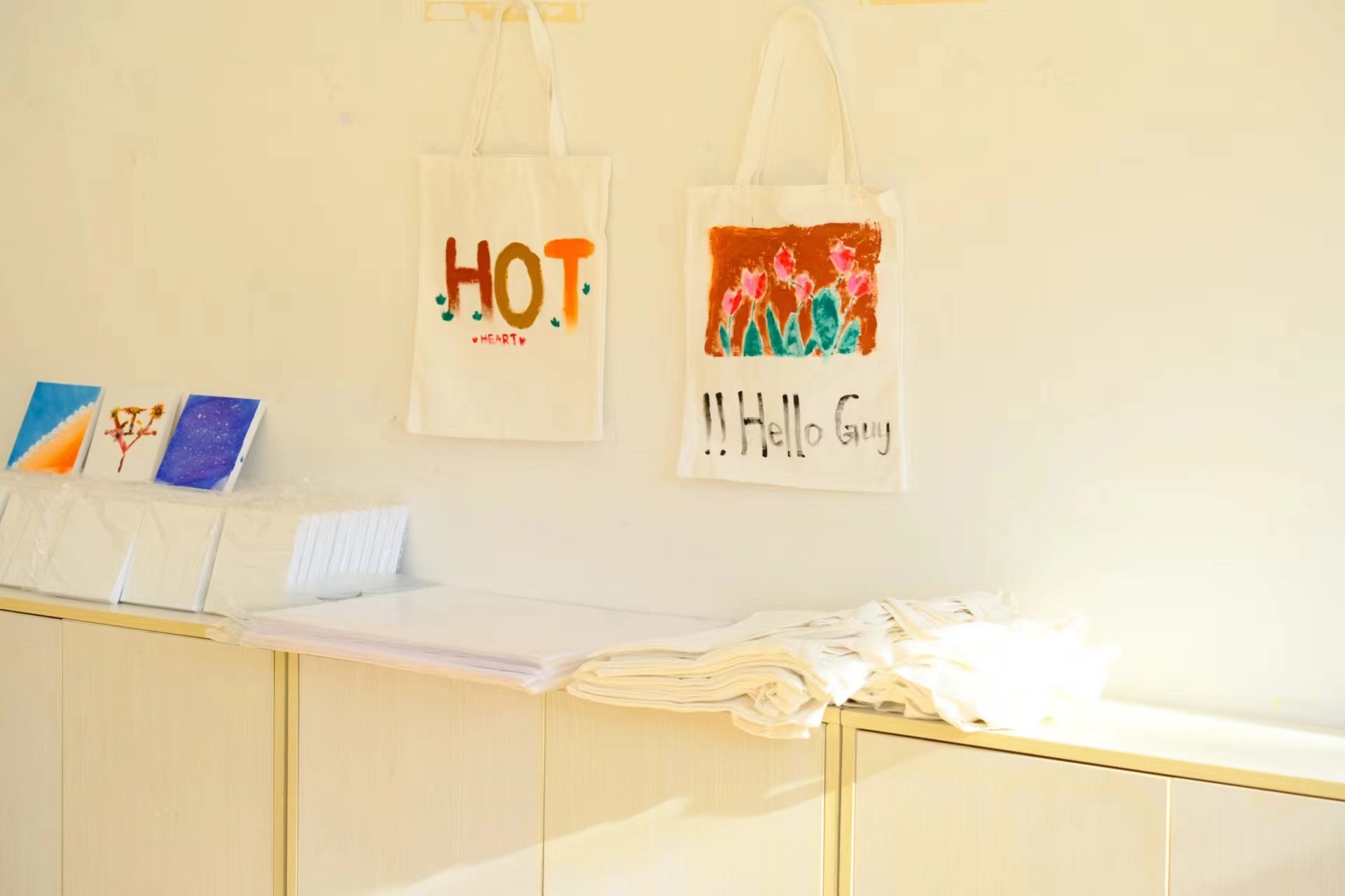 11月24日上午8点活动正式开始,此次活动吸引了众多同学积极参与。活动一开始,大家挑选自己喜欢的画材:画板、画纸或者帆布包,在选定好画材之后各个同学又挑选了自己需要的颜料,随即选定位置开始创作。在创作过程中,同学们静下心来一笔一划描绘出自己内心的构想和感受,展示着自己的创造力和艺术天赋。在创作结束之后,同学们纷纷自发将作品留在活动室内,形成了一个小型展览会,同学们在作品周围交流创作灵感,分享创作心得,现场气氛轻松愉悦,一片欢声笑语。
