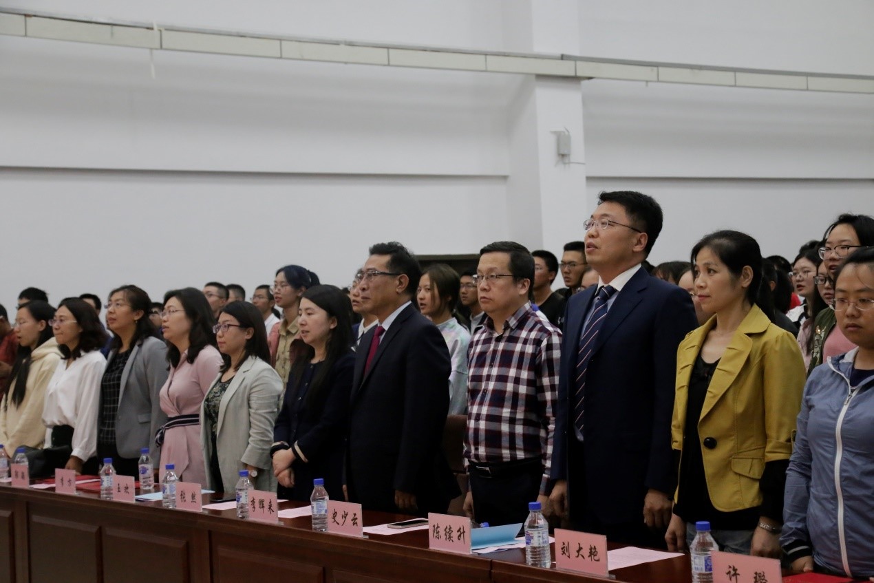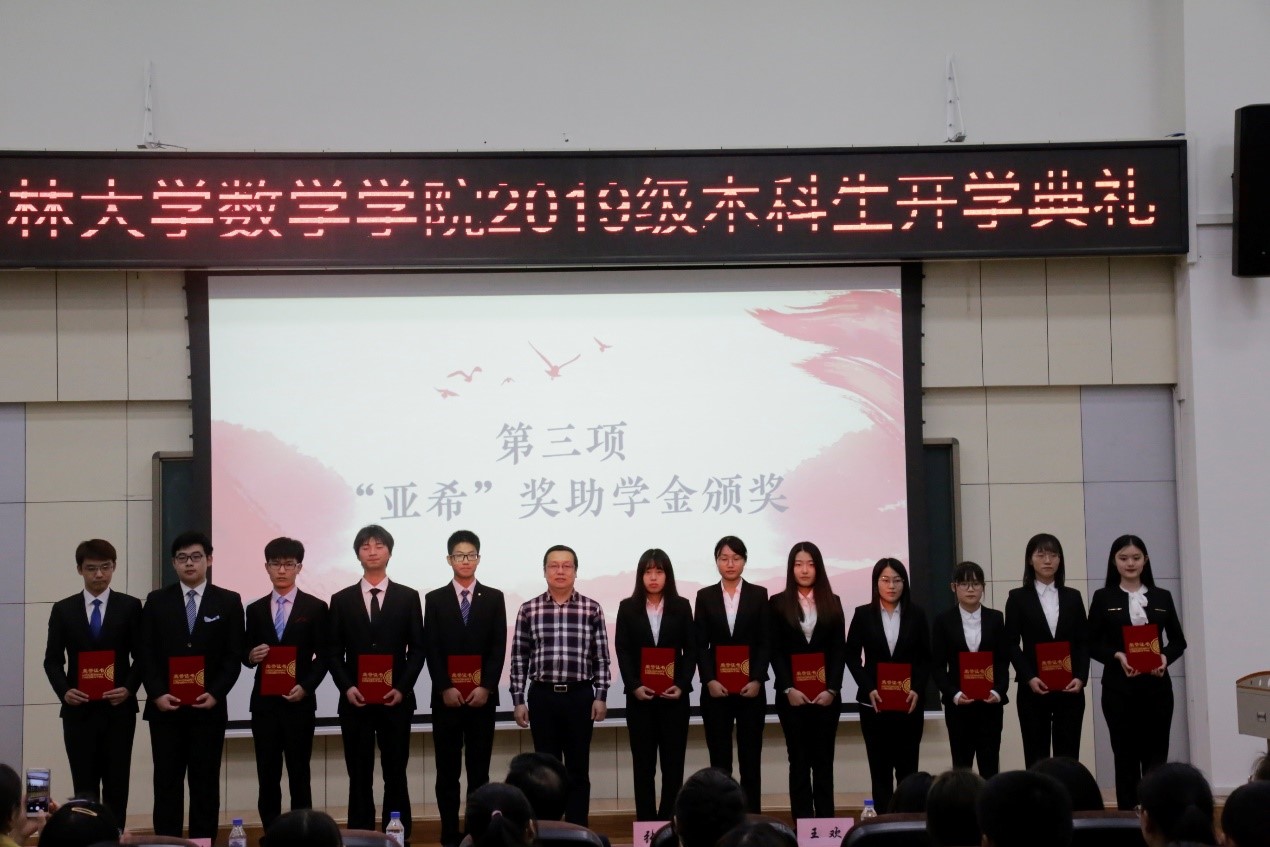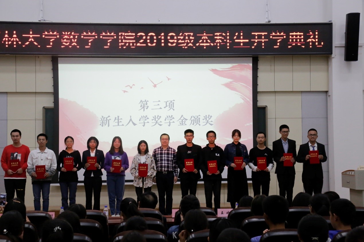 在数学楼二楼报告厅举行了2019级本科新生开学典礼。院长李辉来教授、党委书记张然教授、副院长史少云教授、党委副书记兼纪委书记王欢老师、行政副院长陈续升老师、于浩然等七位新生班主任以及2019级全体同学参加了本次开学典礼。典礼由b站