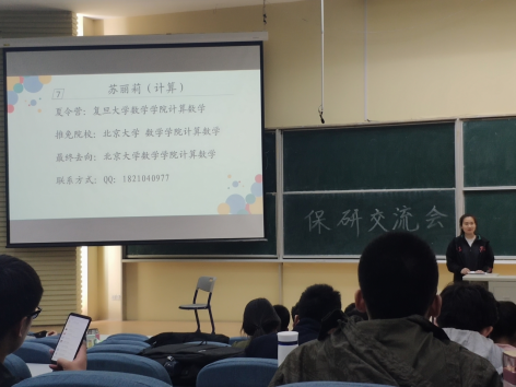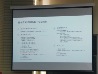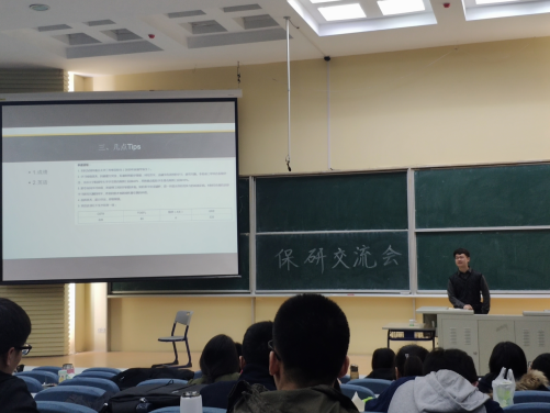 袁甜真学姐向我们详细地讲述了夏令营的申请时间表、注意事项等。玉鑫霖学长分享了他保研北大汇丰的经历以及他对出国和保研的看法,为想要报考金融方向的同学提出了几点建议。保送到浙江大学的谢天培学长则针对了保研和考研的选择分享了他的看法,并重点强调了数学和英语的重要性。还为我们分享了他的面试技巧。张延学长则是从他参加夏令营的自身经历出发,要多了解目标学校夏令营的申请条件和相关资讯,还给我们展示了清华大学的直博考试真题。保送至上海交通大学的高伟航学长也针对夏令营的前期准备给我们进行了详细的讲解,要及早确定自己想要发展的方向。张远江学长分享了他五月校招保送至中国科学技术大学的经验。保送至北京大学的苏丽莉学姐介绍了保研的前期准备,也给我们推荐了数学分析和高等代数的参考书,同时强调了英语在夏令营、保研面试中的重要性。