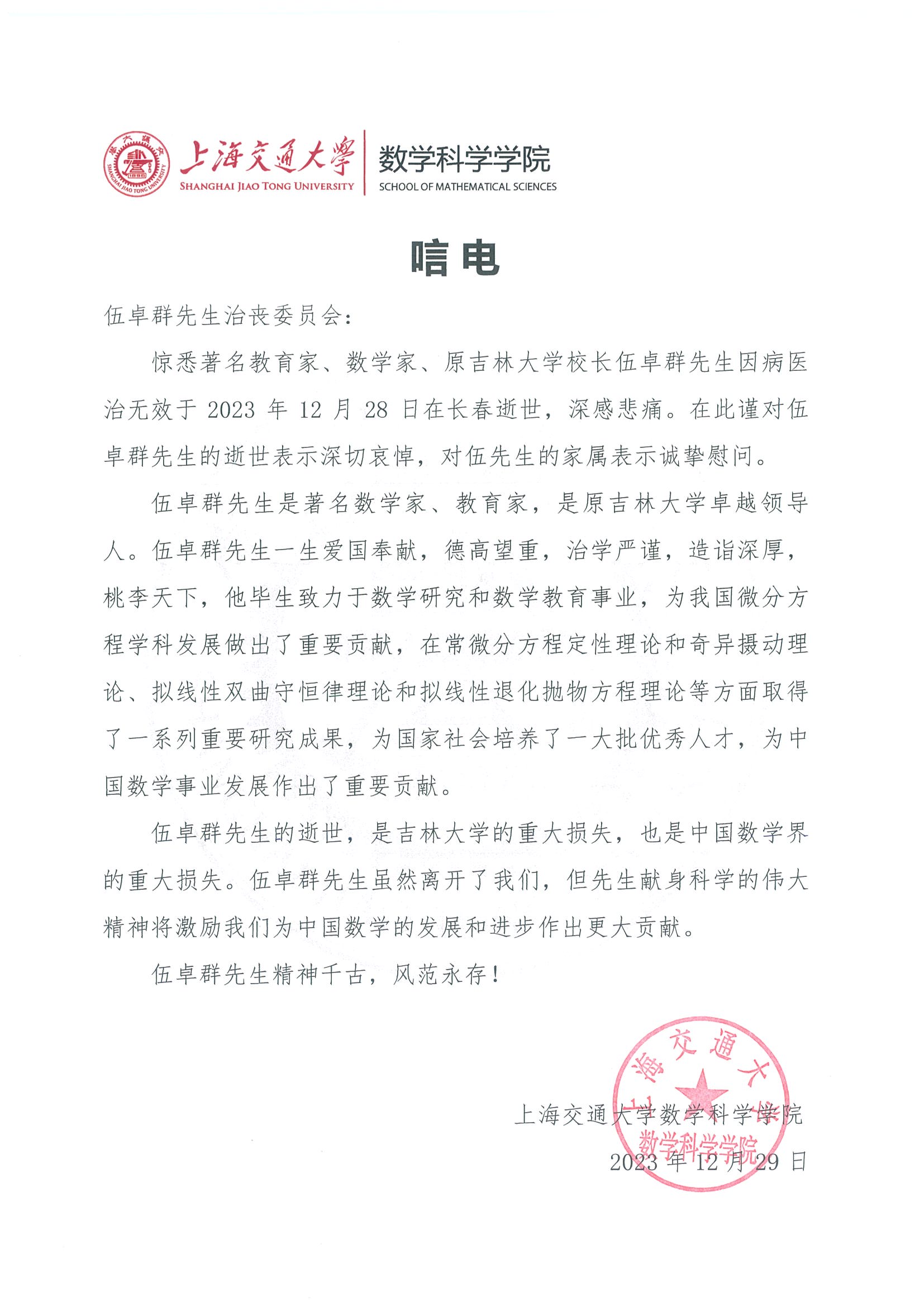 上海交通大学数学科学学院唁电