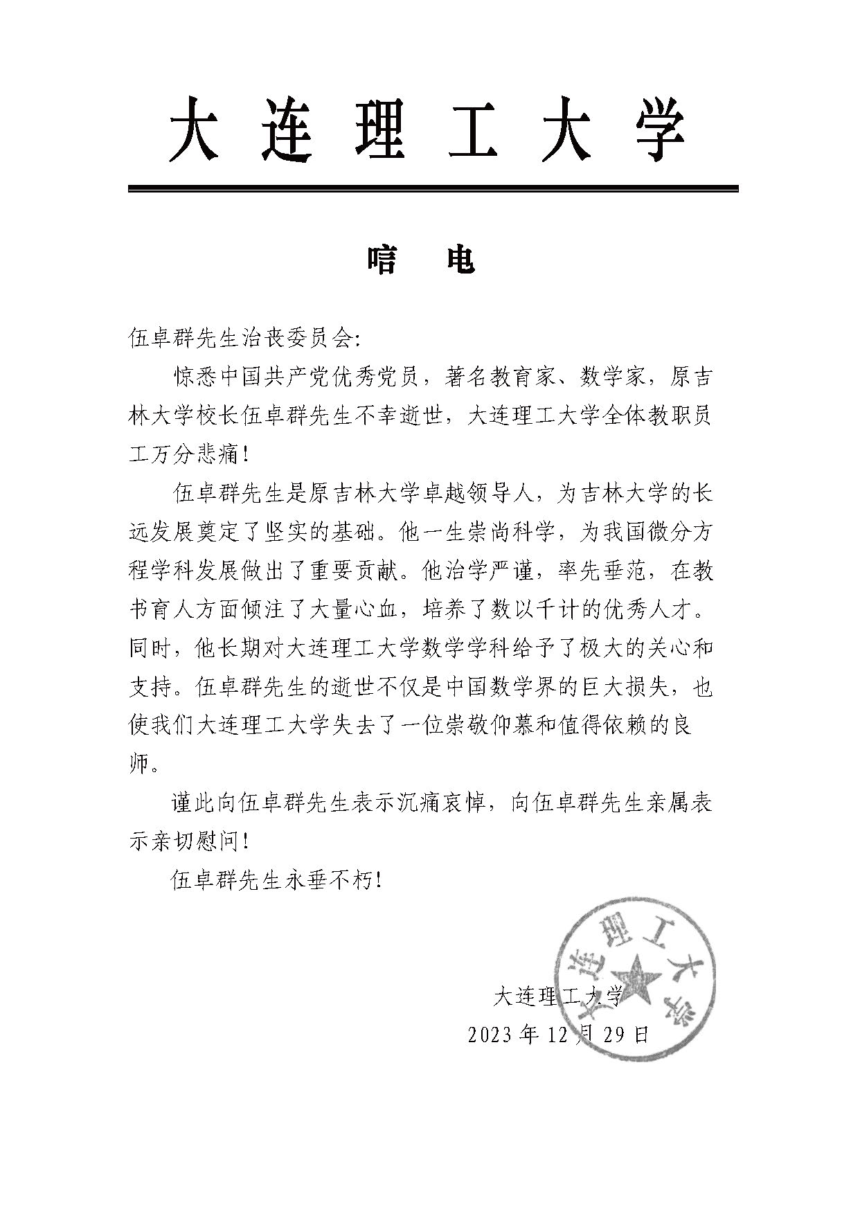 大连理工大学唁电