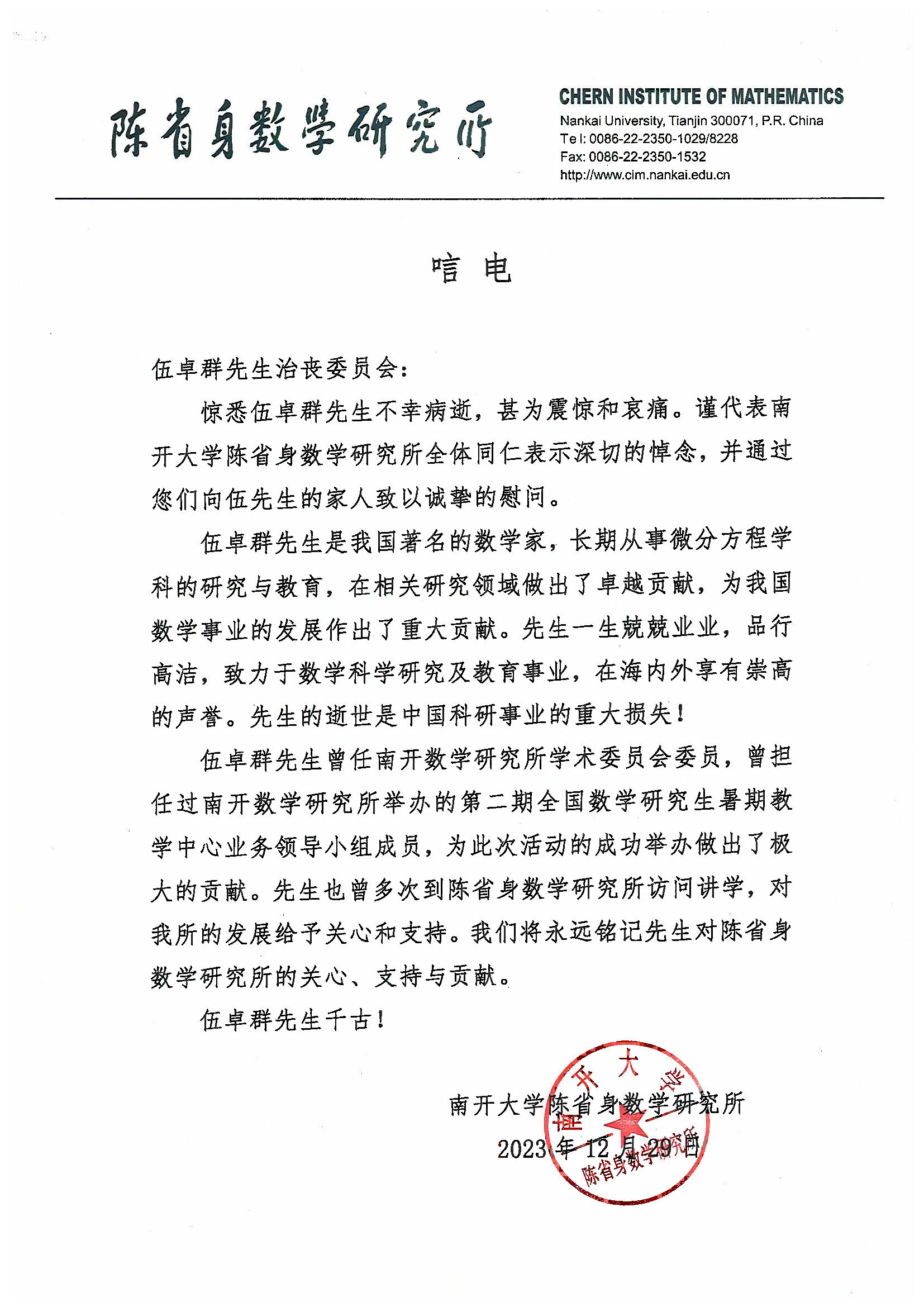 南开大学陈省身数学研究所唁电