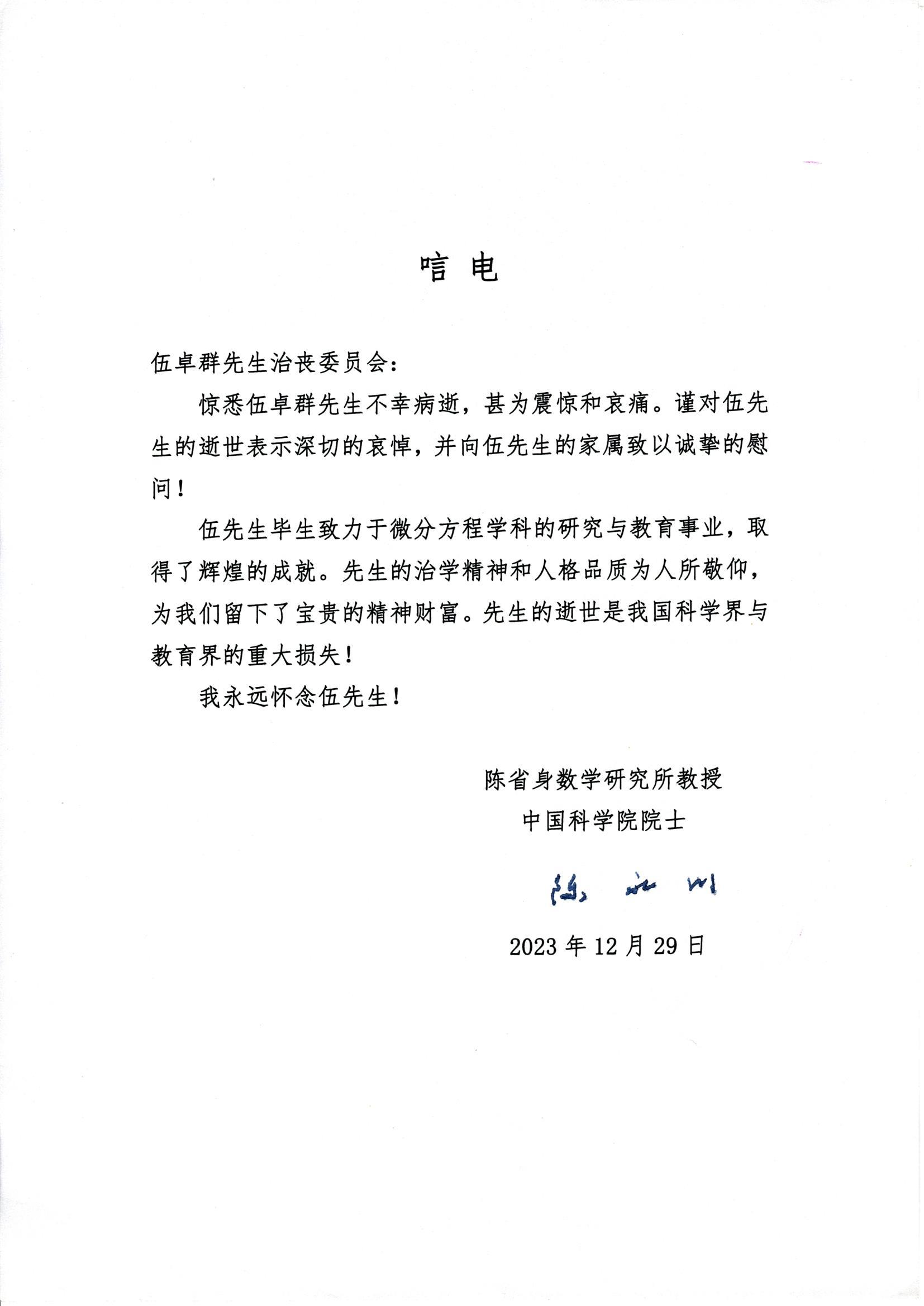 南开大学龙以明院士唁电