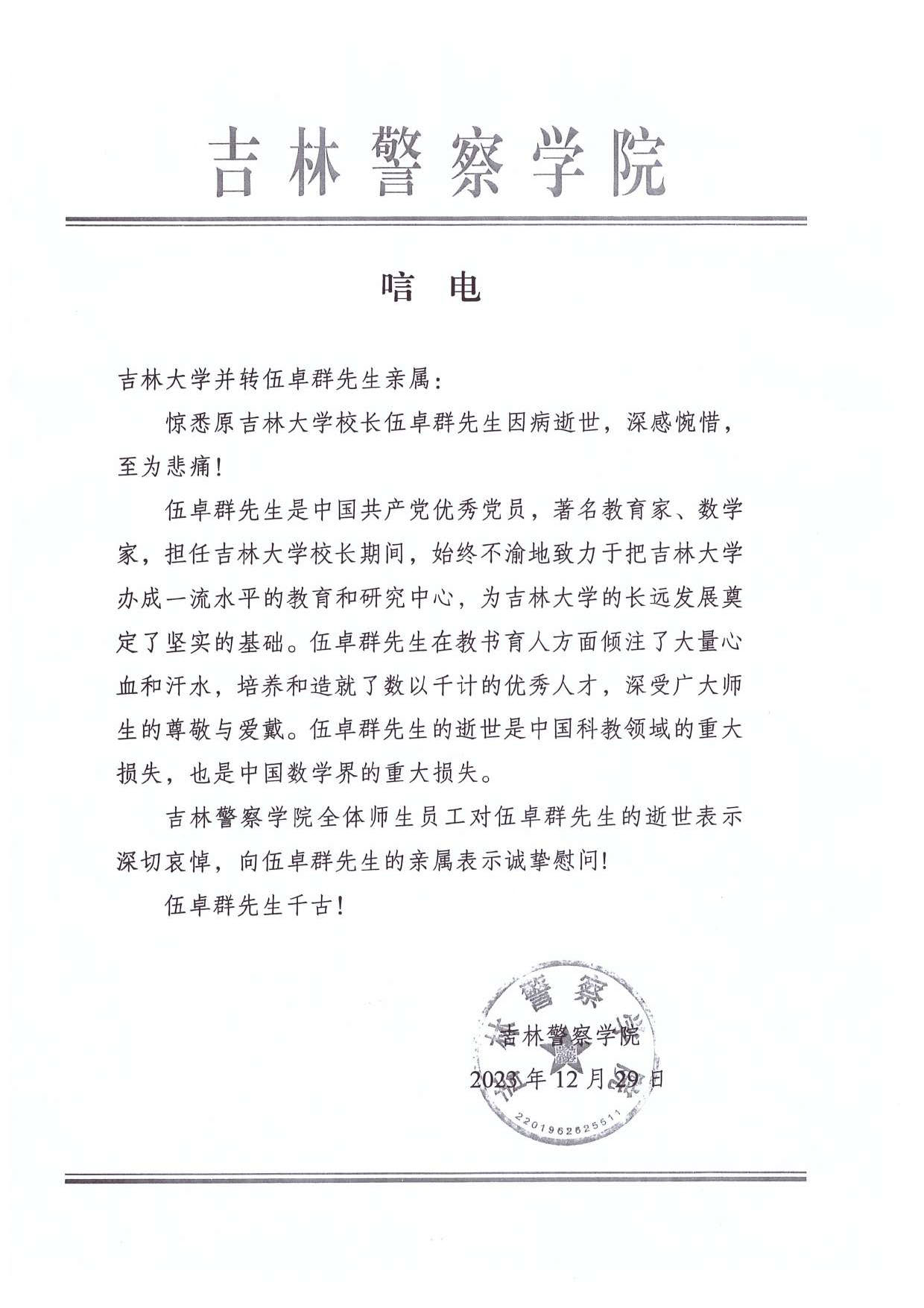 吉林警察学院唁电