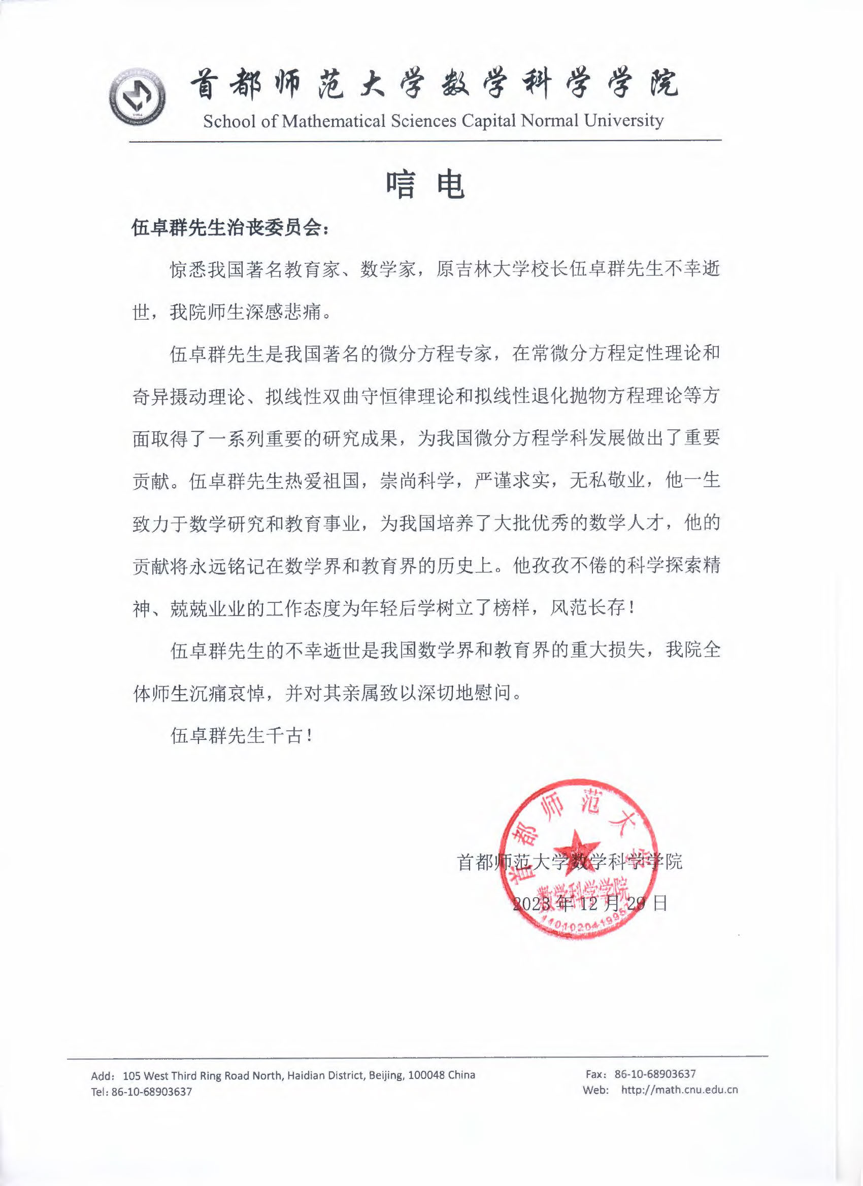 首都师范大学数学科学学院唁电