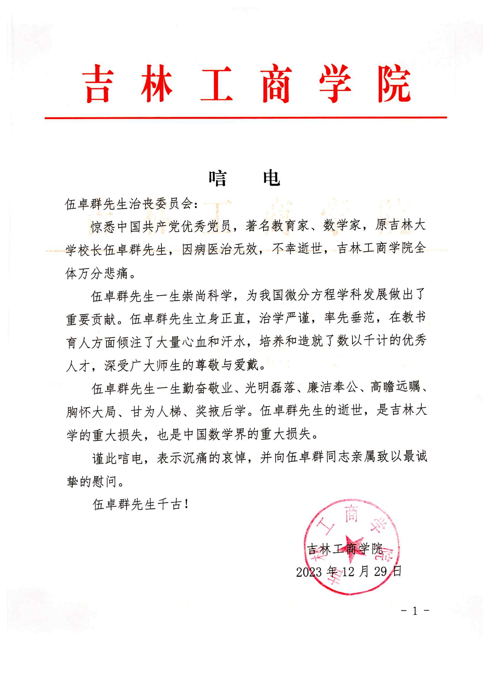 吉林工商学院唁电