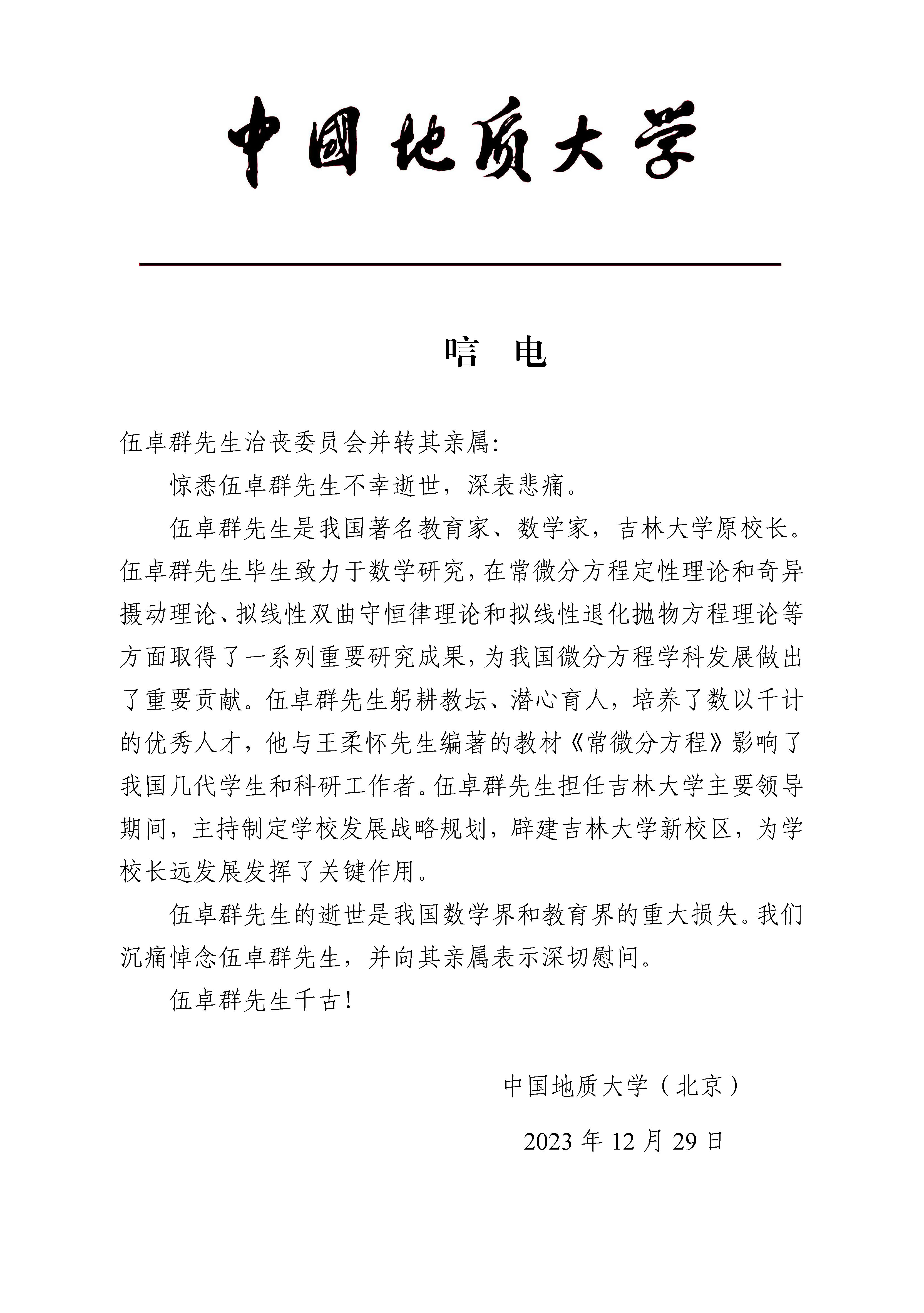 中国地质大学(北京)唁电