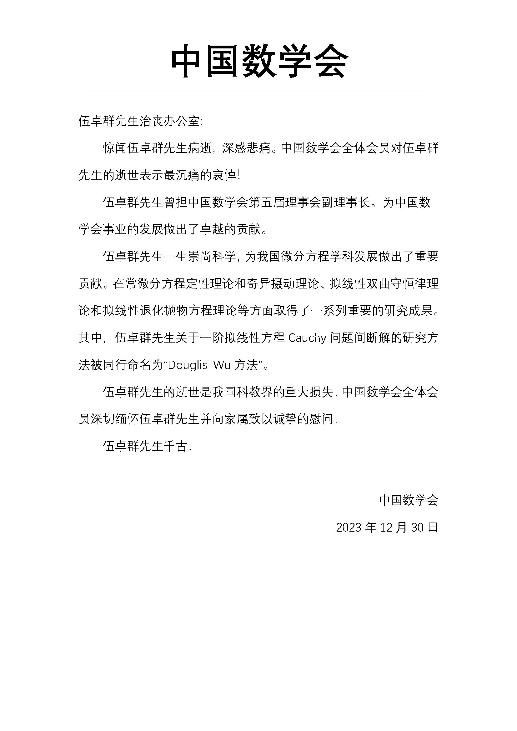 中国数学会唁电